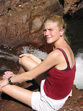 The Top End is a very sunny place during the Dry (the rest of the year when it isn't raining). She is just dipping her toes in Walker Creek, because she already guessed that no place could be this nice and not be filled with tourists. It just had to have crocs or leeches. Well, she was right. (Actually, the water was just too cold for her.) |